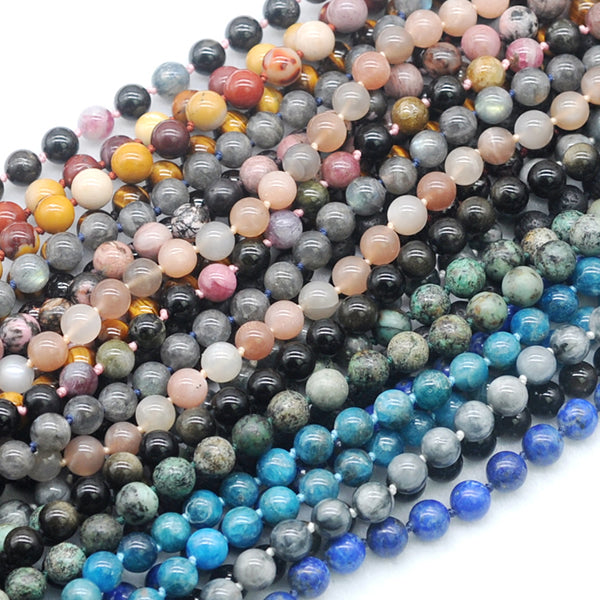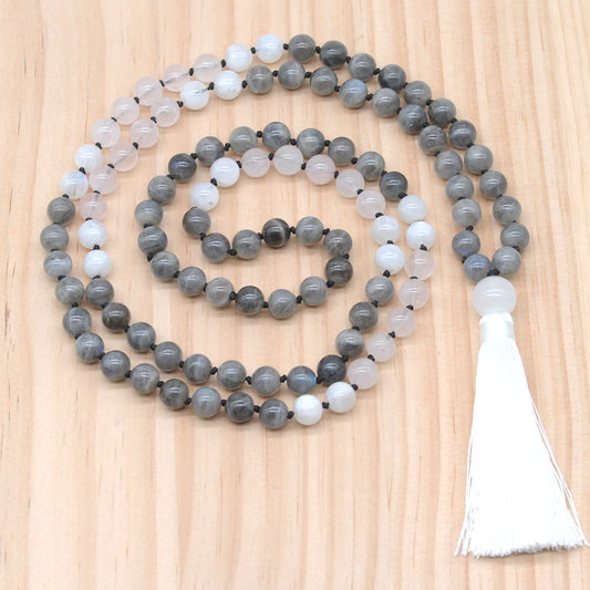 GMN385 Hand-Knotted Labradorite, Rose Quartz & White Moonstone 108 Beads Mala Necklace