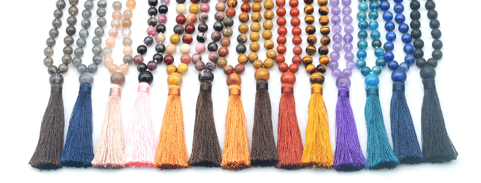 GMN386 Hand-Knotted Amethyst, Citrine & Clear Quartz 108 Beads Mala Necklace