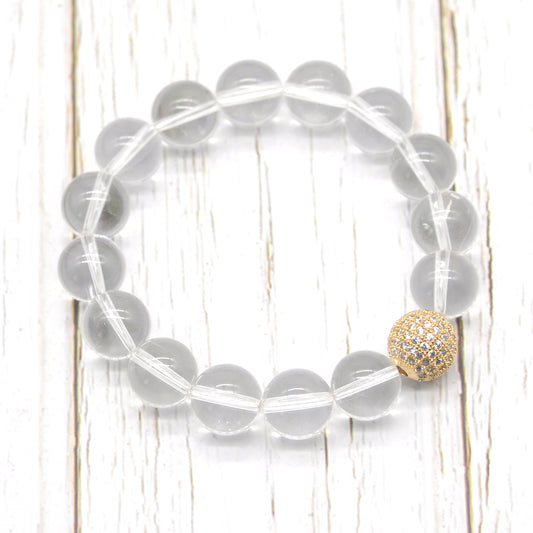 CGB201 Clear Quartz With Zircon Ball Stretch Bracelet Round 10mm 12mm