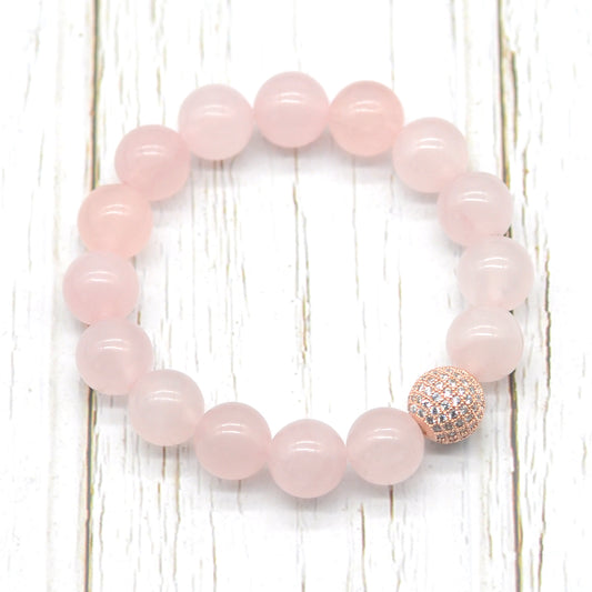 CGB202 Rose Quartz With Zircon Ball Stretch Bracelet Round 10mm 12mm
