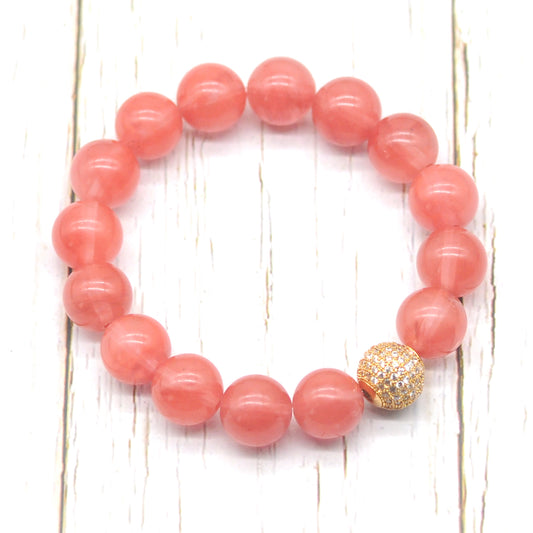 CGB203 Cherry Quartz With Zircon Ball Stretch Bracelet Round 10mm 12mm