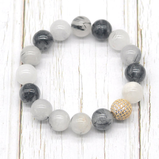 CGB210 Black Rutilated Quartz With Zircon Ball Stretch Bracelet Round 10mm 12mm