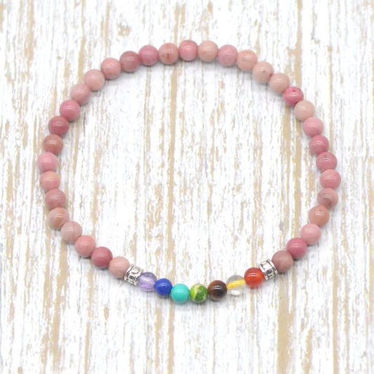 CGB916 Pink Wood Jasper With 7 Chakra Stretch Bracelet Round 4mm