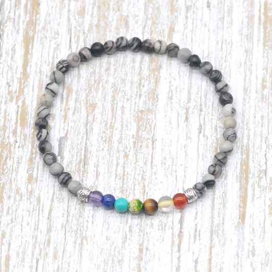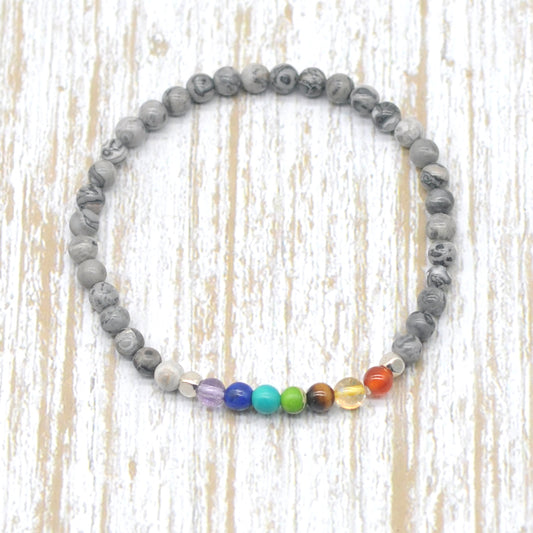 CGB922 Grey Picture Jasper With 7 Chakra Stretch Bracelet Round 4mm