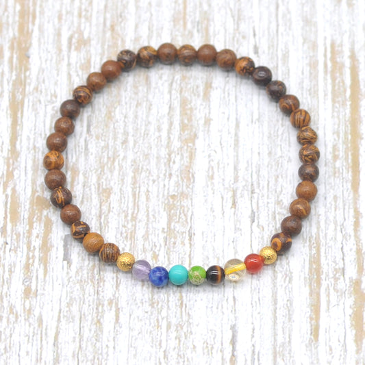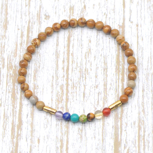 CGB923 Yellow Wood Grain Jasper With 7 Chakra Stretch Bracelet Round 4mm