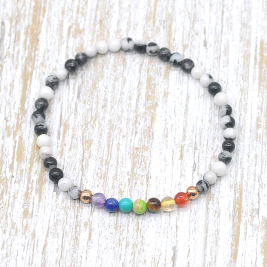 CGB926 Black & White Jasper With 7 Chakra Stretch Bracelet Round 4mm