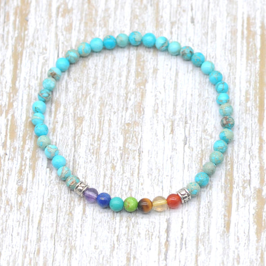 CGB933 Blue Sea Sediment Jasper With 7 Chakra Stretch Bracelet Round 4mm