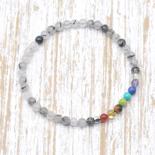 CGB939 Black Rutilated Quartz With 7 Chakra Stretch Bracelet Round 4mm