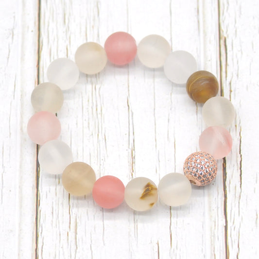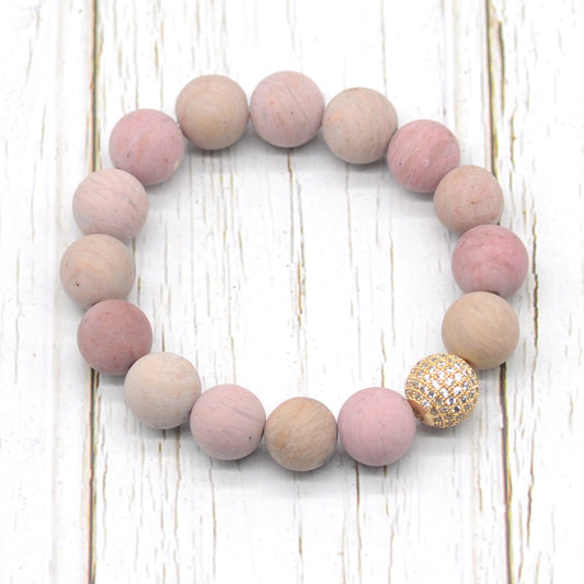CGB261 Pink Wood Jasper With Zircon Ball Stretch Bracelet Matte Round 10mm 12mm