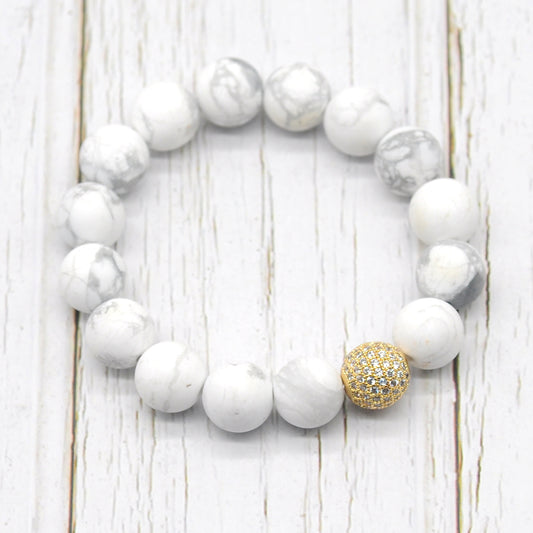 CGB252 White Howlite With Zircon Ball Stretch Bracelet Matte Round 10mm 12mm