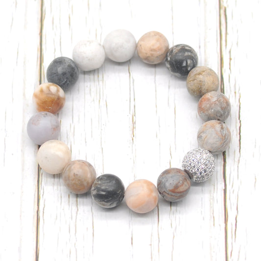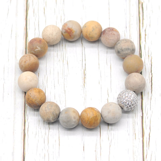 CGB256 Fossil Coral With Zircon Ball Stretch Bracelet Matte Round 10mm 12mm