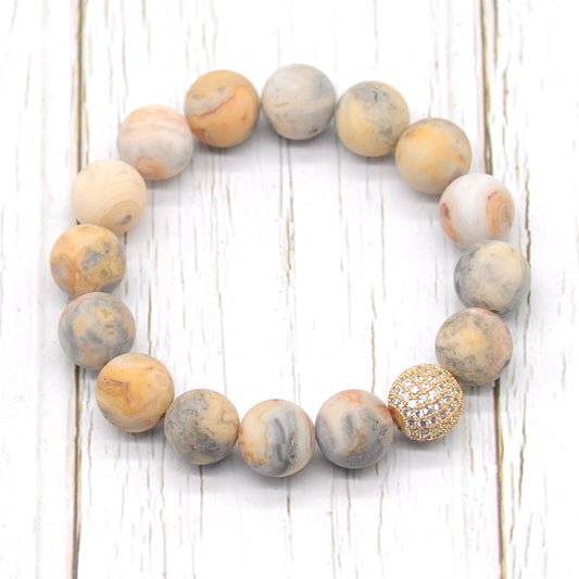 CGB255 Yellow Crazy Lace Agate With Zircon Ball Stretch Bracelet Matte Round 10mm 12mm
