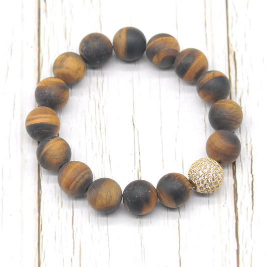 CGB258 Yellow Tiger Eye With Zircon Ball Stretch Bracelet Matte Round 10mm 12mm
