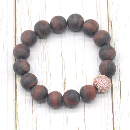CGB259 Red Tiger Eye With Zircon Ball Stretch Bracelet Matte Round 10mm 12mm