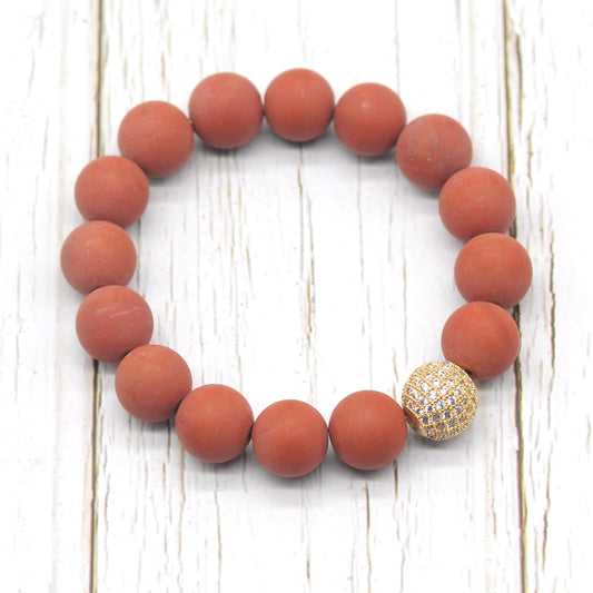 CGB262 Red Wood Jasper With Zircon Ball Stretch Bracelet Matte Round 10mm 12mm