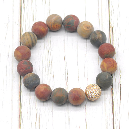 CGB263 Picasso Jasper With Zircon Ball Stretch Bracelet Matte Round 10mm 12mm