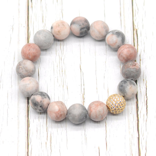 CGB264 Pink Zebra Jasper With Zircon Ball Stretch Bracelet Matte Round 10mm 12mm
