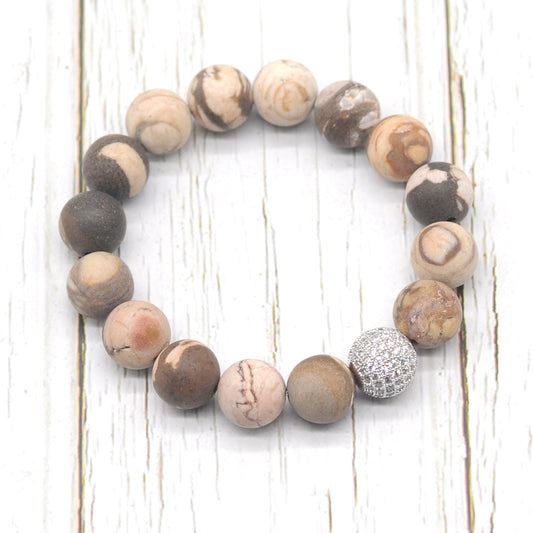 CGB265 Australian Zebra Jasper With Zircon Ball Stretch Bracelet Matte Round 10mm 12mm