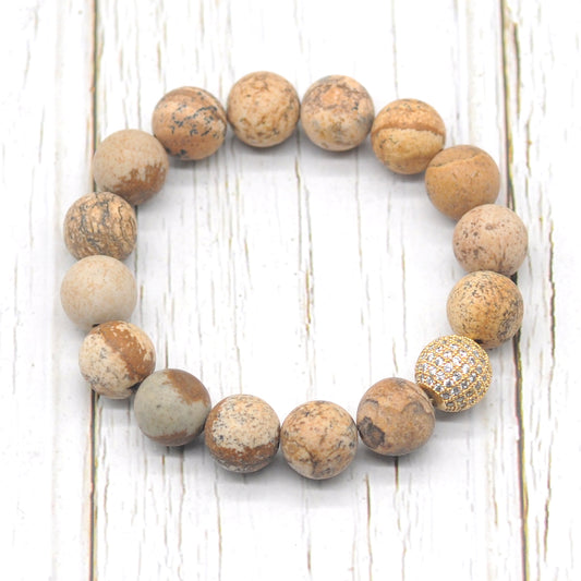 CGB266 Picture Jasper With Zircon Ball Stretch Bracelet Matte Round 10mm 12mm