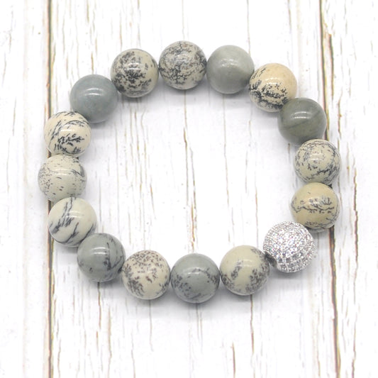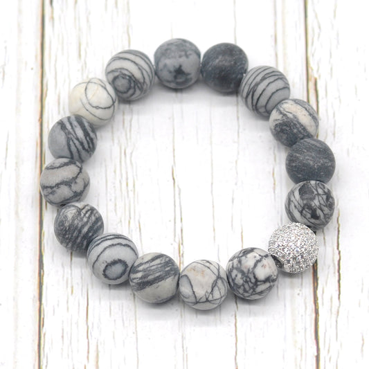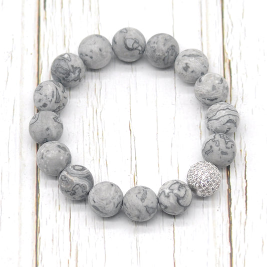 CGB267 Grey Picture Jasper With Zircon Ball Stretch Bracelet Matte Round 10mm 12mm