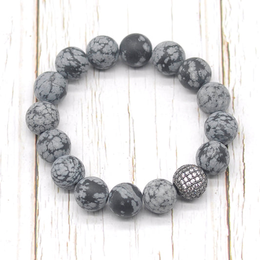 CGB270 Snowflake Obsidian With Zircon Ball Stretch Bracelet Matte Round 10mm 12mm