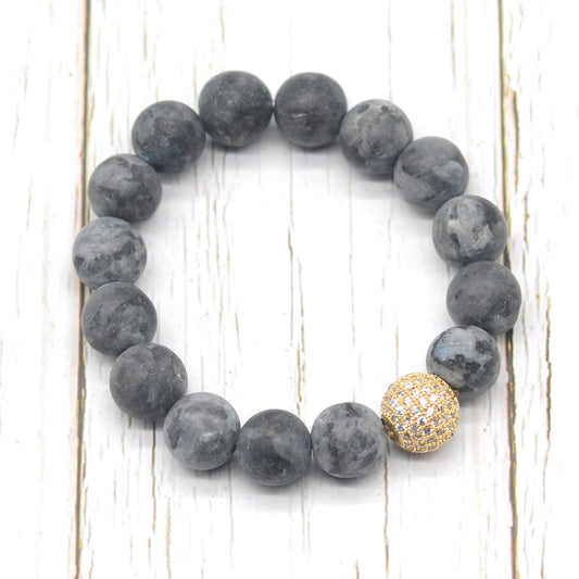 CGB271 Black Labradorite With Zircon Ball Stretch Bracelet Matte Round 10mm 12mm