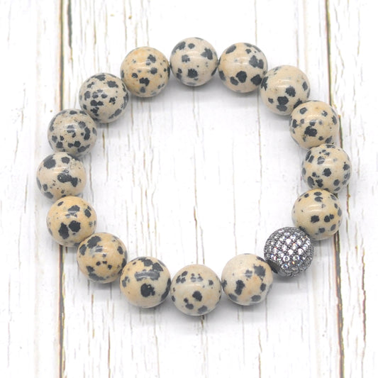 CGB293 Dalmatian Jasper With Zircon Ball Stretch Bracelet Round 10mm 12mm