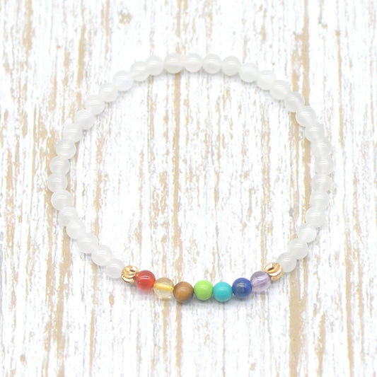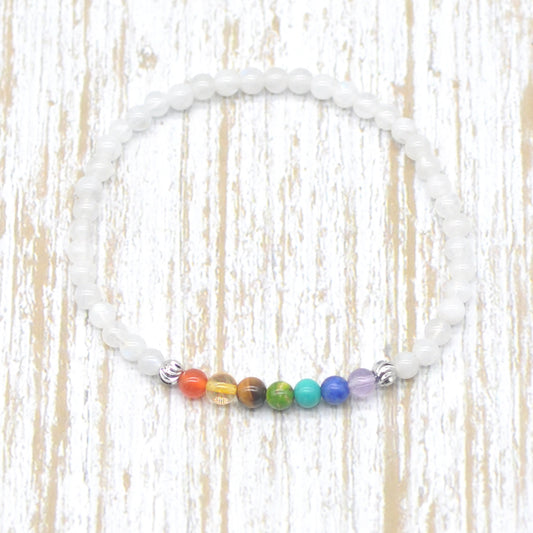 CGB950 White Moonstone With 7 Chakra Stretch Bracelet Round 4mm