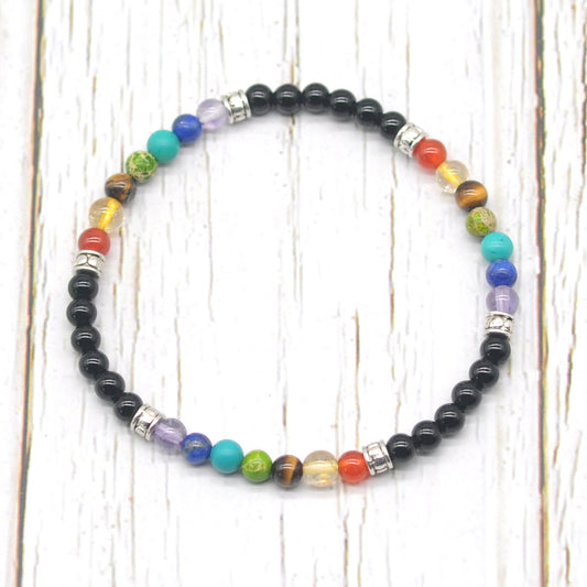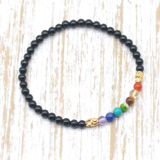 CGB965 Black Onyx With 7 Chakra Stretch Bracelet Round 4mm