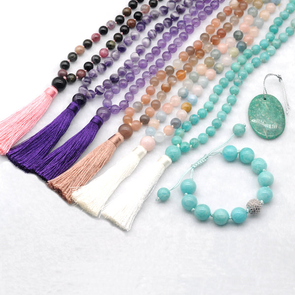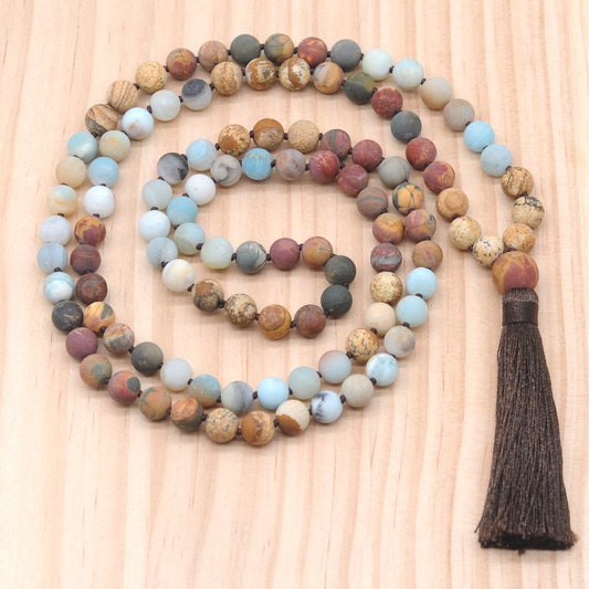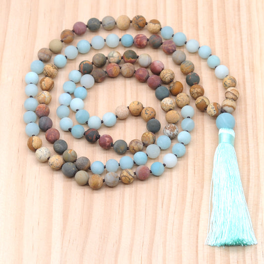 GMN368 Hand-Knotted Matte Colorful Amazonite & Mixed Jasper 108 Beads Mala Necklace