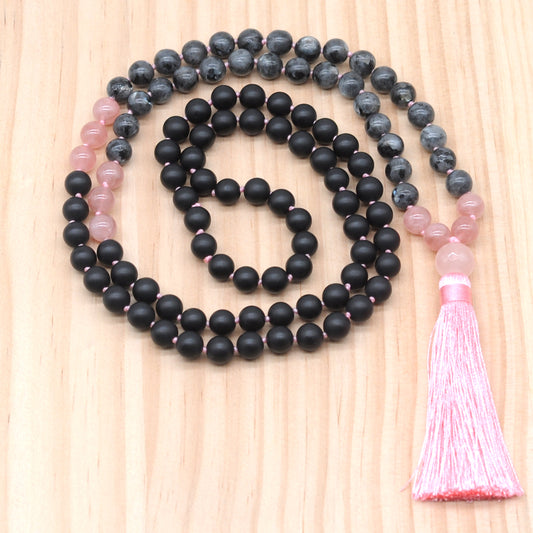 GMN366 Hand-Knotted matte black agate, black labradorite & rose quartz 108 Beads Mala Necklace