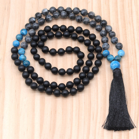 GMN367 Hand-Knotted Matte Black Agate, Black Labradorite & Apatite 108 Beads Mala Necklace