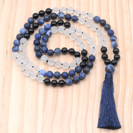 GMN370 Hand-Knotted Matte Sodalite, White Crystal & Black Agate 108 Beads Mala Necklace