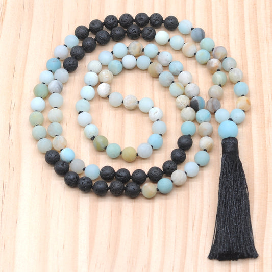 GMN372 Hand-Knotted Matte Colorful Amazonite & Black Lava 108 Beads Mala Necklace