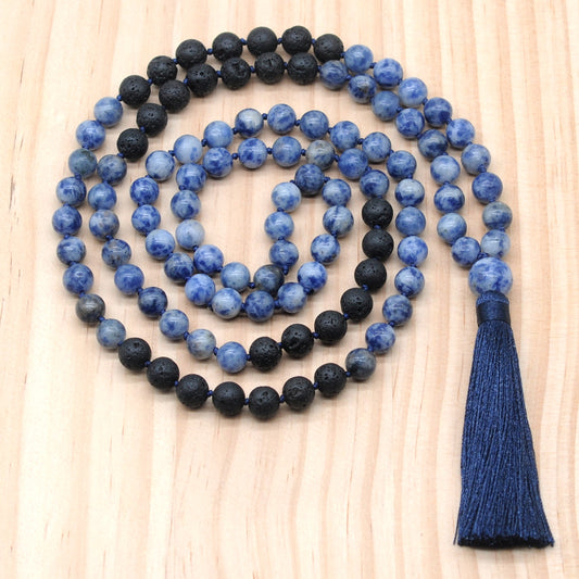 GMN373 Hand-Knotted Blue Spot Stone & Black Lava 108 Beads Mala Necklace