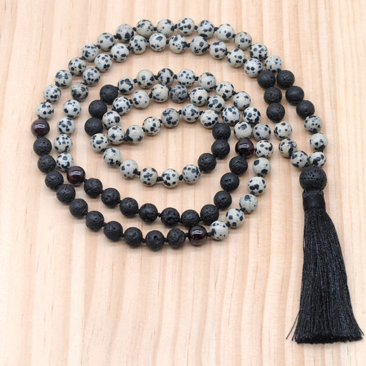 GMN374 Hand-Knotted Dalmatian Jasper, Black Lava & Garnet 108 Beads Mala Necklace