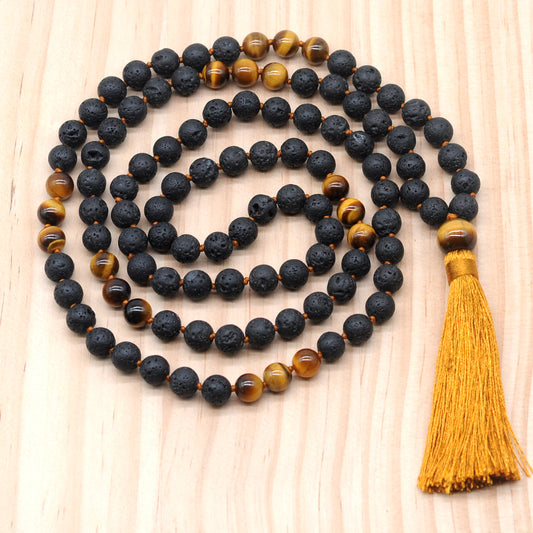 GMN375 Hand-Knotted Black Lava & Yellow Tiger Eye 108 Beads Mala Necklace