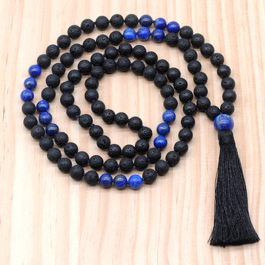 GMN377 Hand-Knotted Black Lava & Lapis Lazuli 108 Beads Mala Necklace