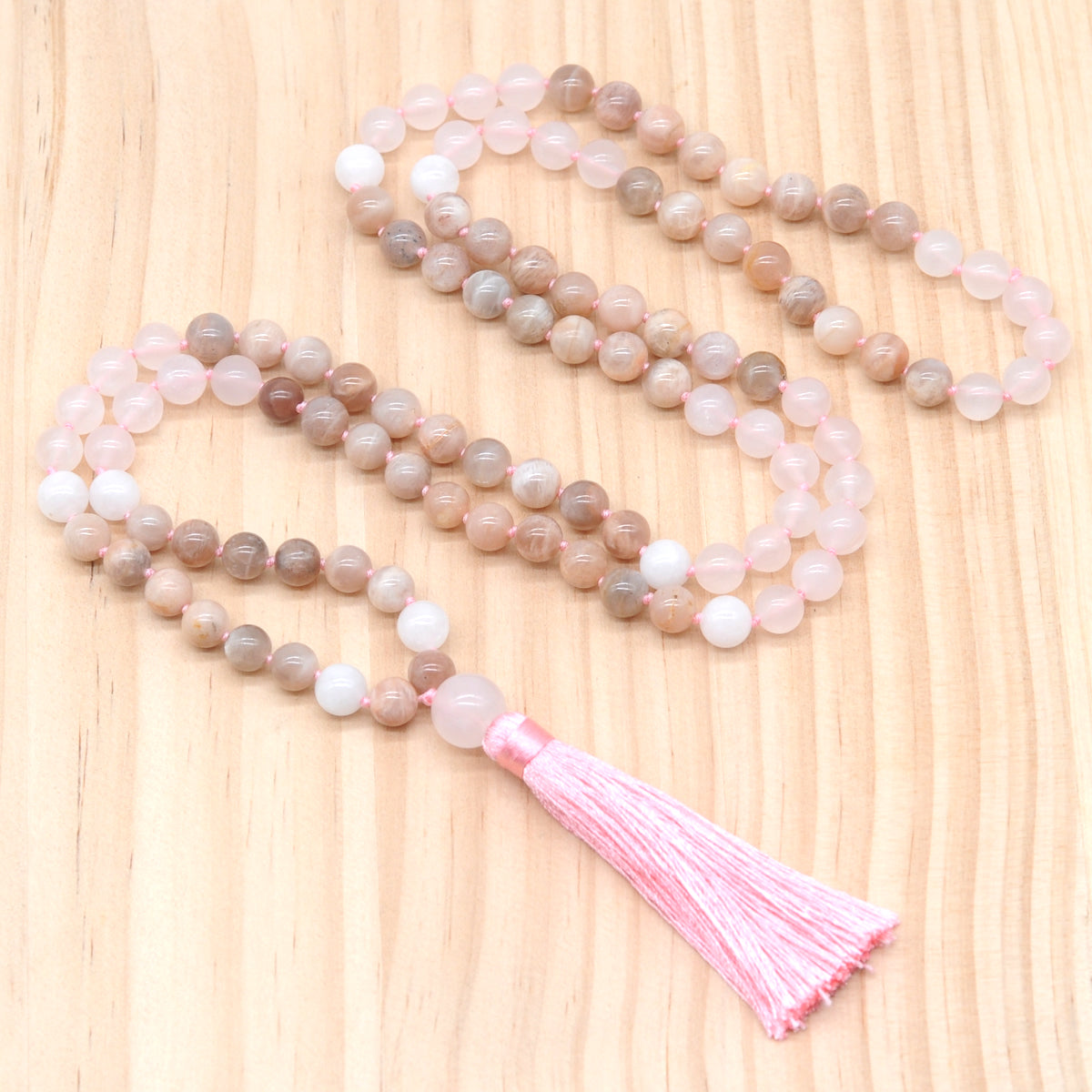 GMN381 Hand-Knotted Sunstone, Rose Quartz & White Jade 108 Beads Mala Necklace