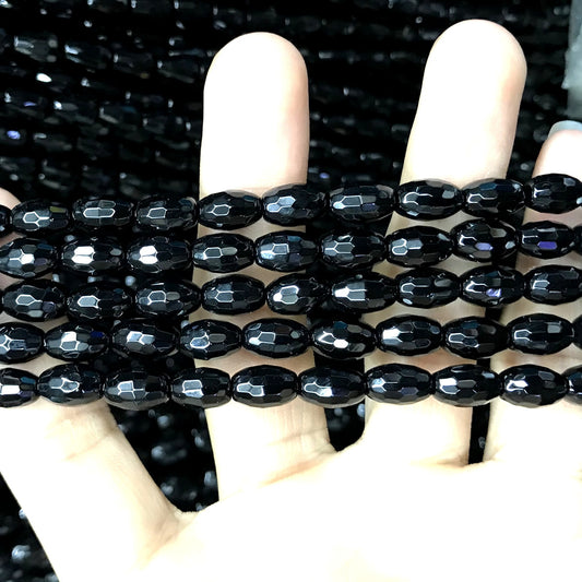 CAG760 Black Agate Beads Faceted Rice 6x9mm 15" Strand