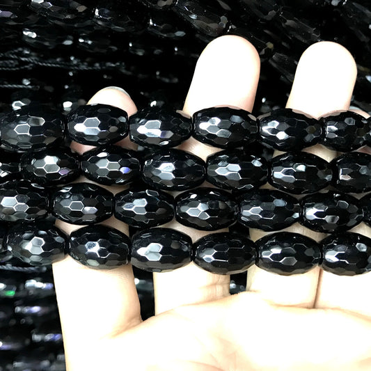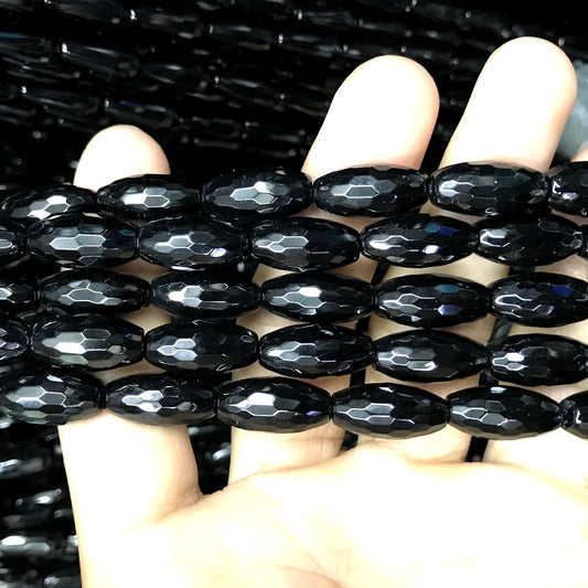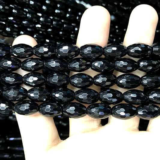 CAG764 Black Agate Beads Faceted Rice 10x14mm 15" Strand