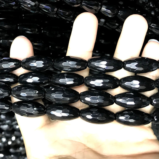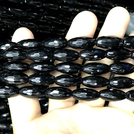 CAG765 Black Agate Beads Faceted Rice 10x20mm 15" Strand