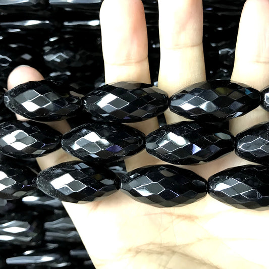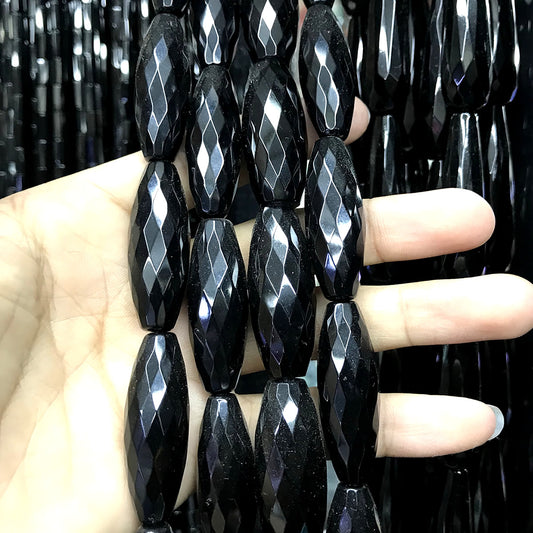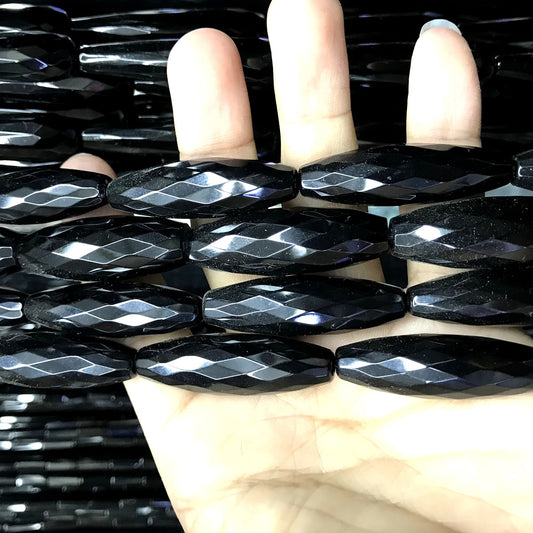 CAG769 Black Agate Beads Faceted Rice 15x30mm 15" Strand