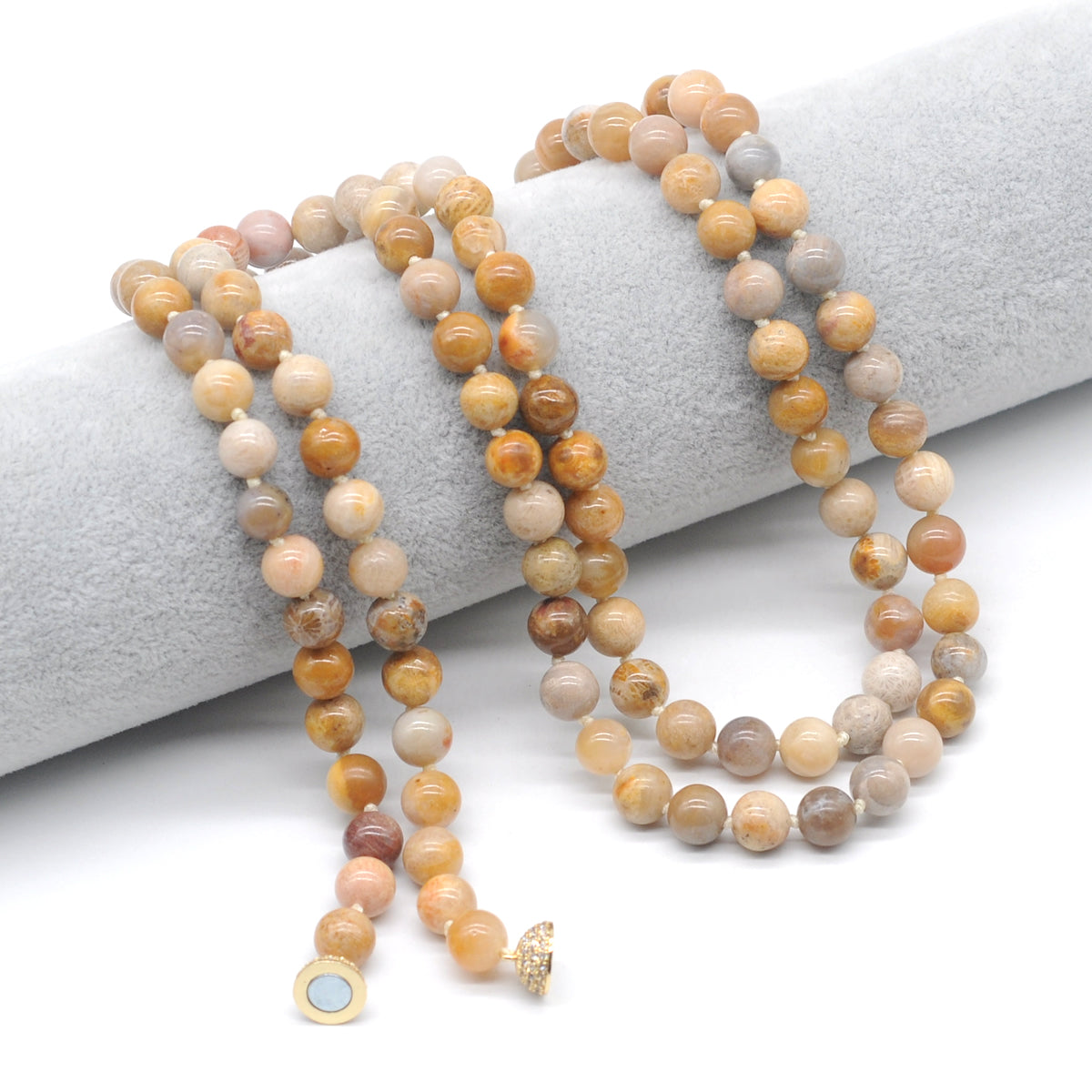 GMN282 Hand-Knotted Fossil Coral Beaded Necklace 8mm 10mm