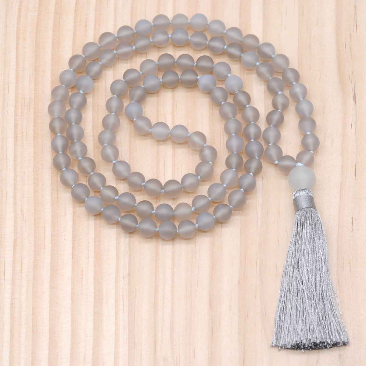 GMN06 Hand-Knotted Matte Grey Agate 108 Beads Mala Necklace
