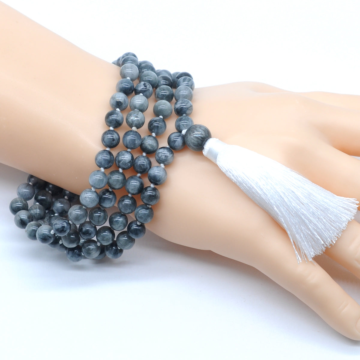 Style No.2: 8mm smooth eagle eye jasper, 12mm smooth eagle eye jasper guru bead & silk tassel (You can choose different tassel)