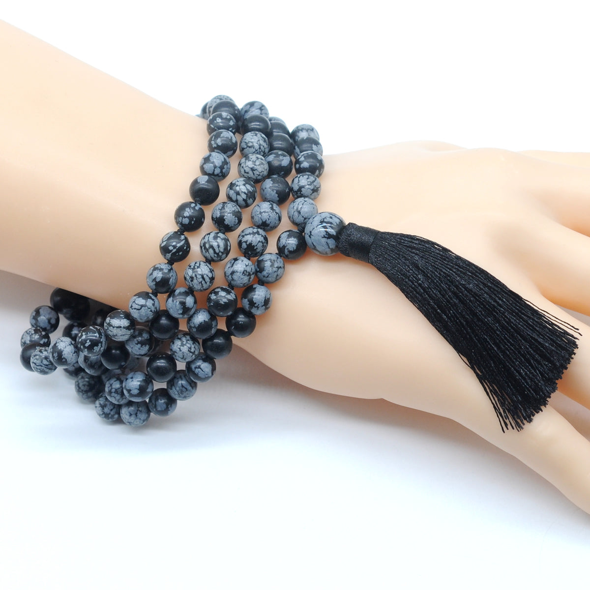 Style No.2: 8mm smooth snowflake obsidian, 12mm smooth snowflake obsidian guru bead & silk tassel (You can choose different tassel)