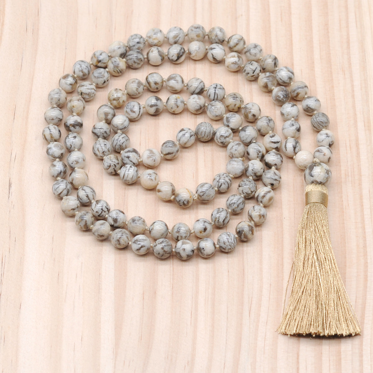 Style No.3: 8mm smooth feldspar, 12mm smooth feldspar guru bead & 8mm smooth feldspar beads tassel