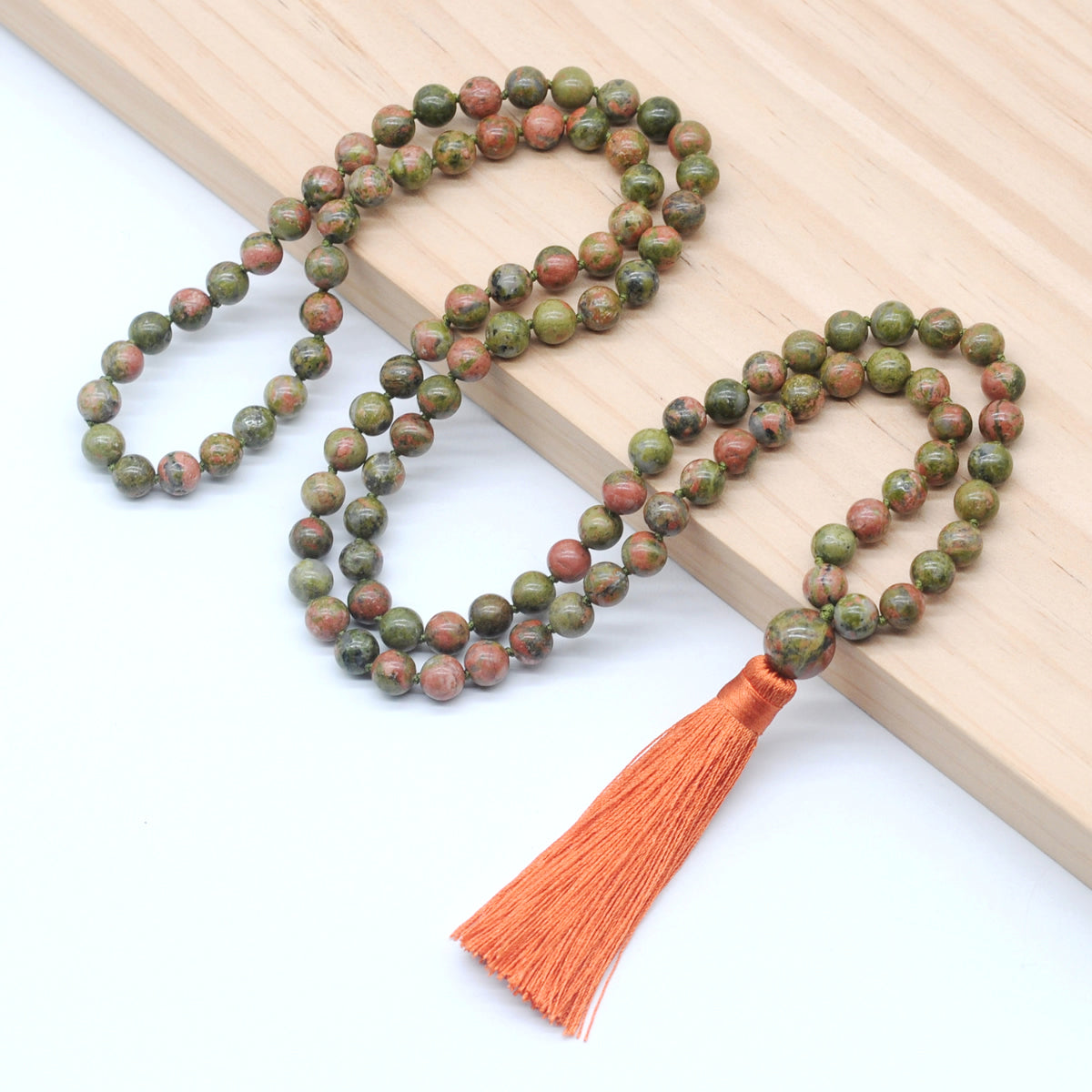 Style No.2: 8mm smooth unakite, 12mm smooth unakite guru bead & silk tassel (You can choose different tassel)