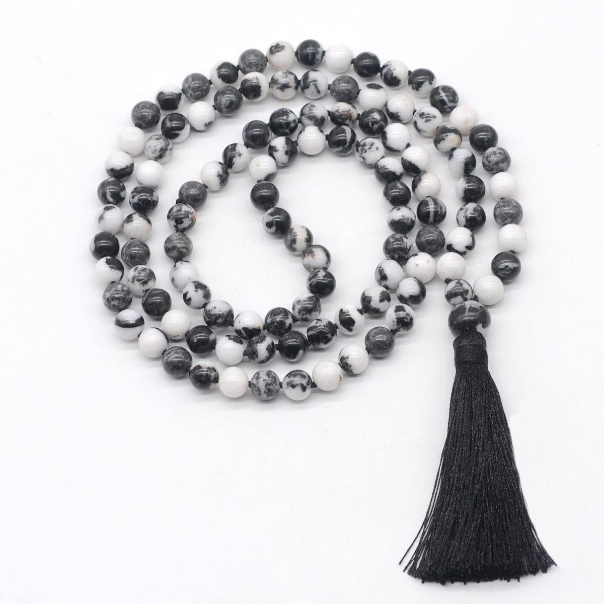 GMN175 Hand-Knotted Smooth Black & White Jasper 108 Beads Mala Necklace